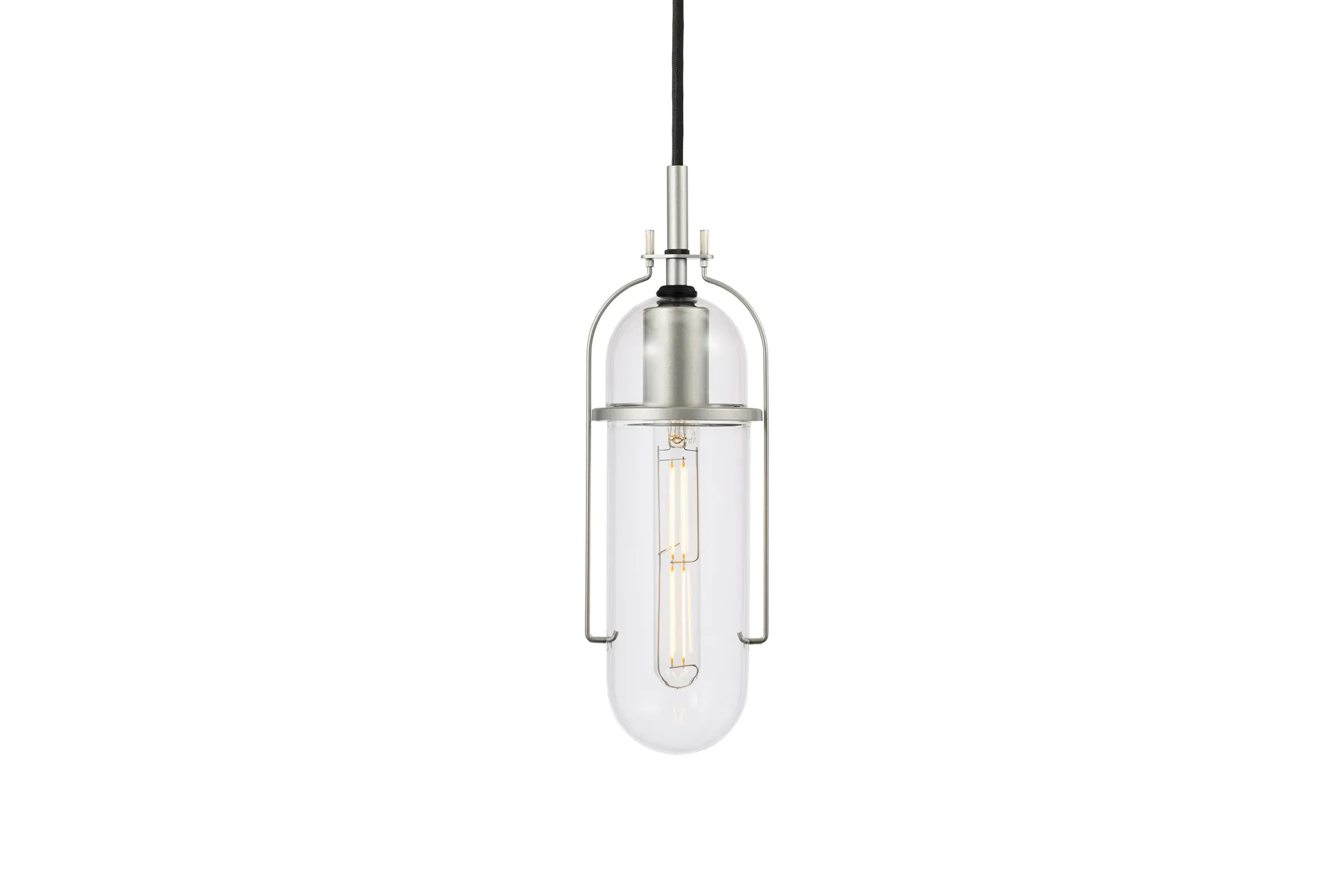 筒状のガラスを縁取る繊細なワイヤーと中央のリングが、絶妙な存在感を放ちます。その端正な姿は、洗練されたカフェや店舗などの商業施設から、こだわりのオフィス空間まで、おしゃれな演出を幅広く叶えます。