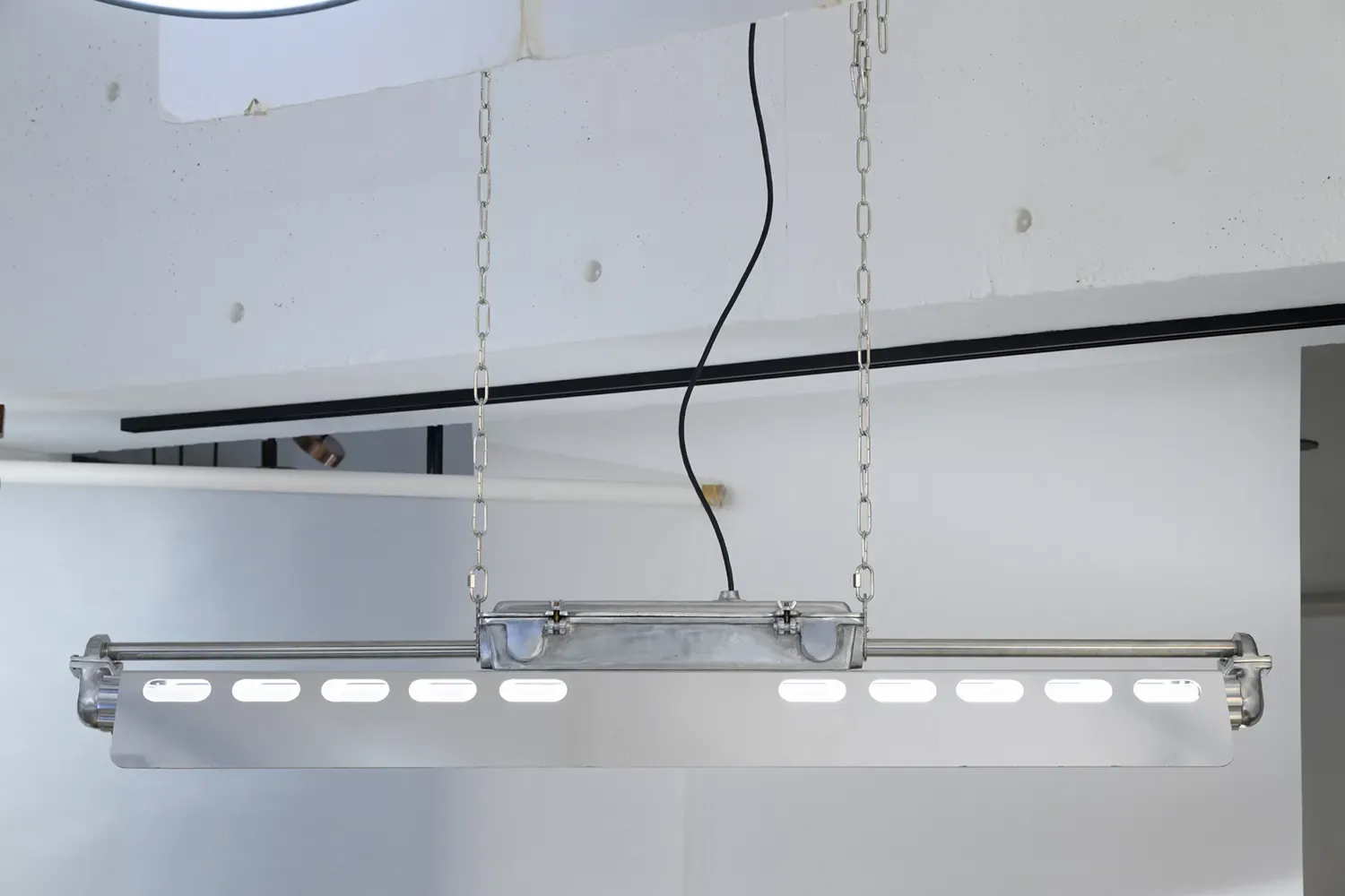 その唯一無二の存在感は、カフェやレストラン、アパレルショップなどの施設照明としておすすめです。LED蛍光灯、チェーン、フランジは日本製を使用。長寿命・省電力に加え、安心・安全性を重視。配線も国内基準に準拠した仕様です。オプションでチェーンの長さなどの加工も可能です。